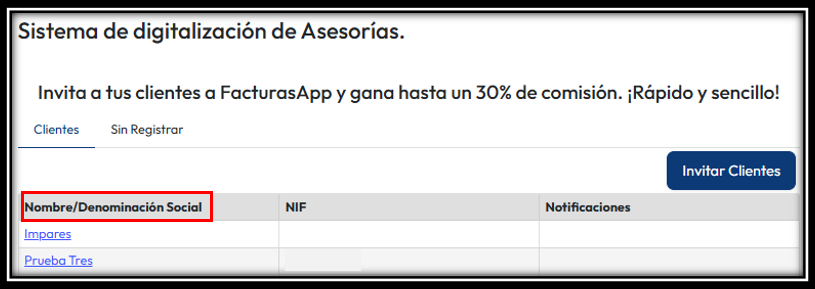En el apartado “Clientes” podrá ver el listado de los clientes de su empresa, los que usan FacturasApp, como los que no aún no han aceptado la invitación:
