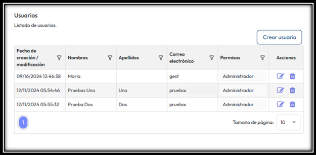 Encontrará el listado de usuarios que pueden utilizar el sistema de FacturasApp, podrá modificarlos o eliminarlos: