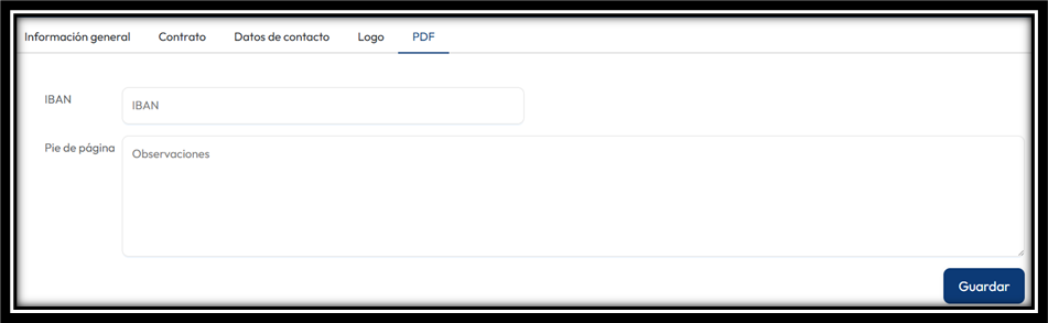 La información que desee ingresar al pie de página de la factura lo podrá configurar aquí, tanto el número de cuenta bancaria IBAN, como el texto que considere necesario: