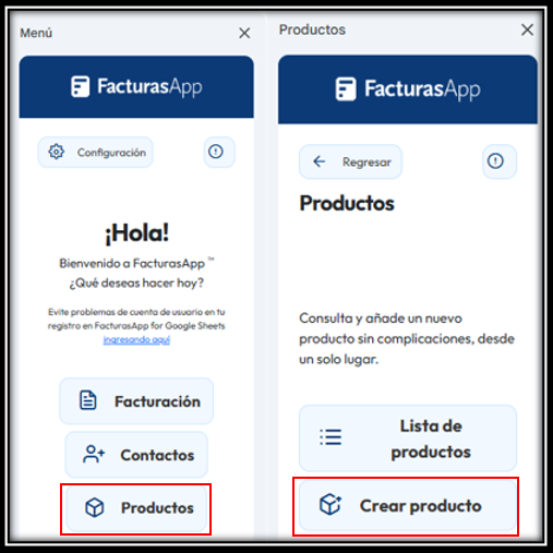 En el menú de la parte derecha de la pantalla, hacer clic en el botón “Productos”, después en “Crear Producto”: