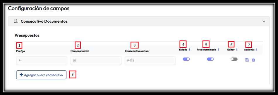 Agregar nuevo consecutivo: permite crear un nuevo consecutivo según las necesidades de tu empresa.