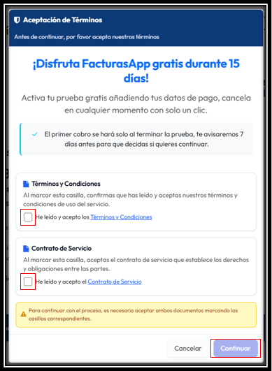Saldrá una ventana, en donde el sistema pide aceptar "El contrato de servicio", y "Los términos y condiciones". Los dos los pueden leer con detalle haciendo clic en los enlaces en azul, de cada uno de ellos. Es indispensable para continuar, el aceptar cada uno de ellos haciendo check en sus cuadriculas; y dar al botón “Continuar”