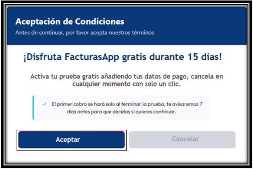 Después, aparecerá una ventana indicando que el proceso fue un éxito, brindando la opción de activar la prueba gratuita, haciendo clic en el botón “Aceptar”