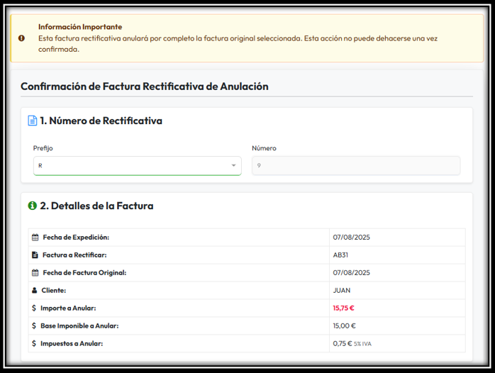 Rectificación Completa, esta opción anula por completo la factura original.