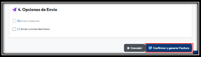 En el paso 4, podrá decidir si quiere enviar la anulación a la Asesoría, por correo electrónico, o simplemente hacer clic en “Confirmar y generar factura” para guardar los cambios: