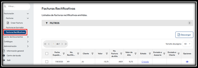 En el menú izquierdo, haciendo clic en “Facturas rectificativas”, podrá ver el resumen de sus facturas: