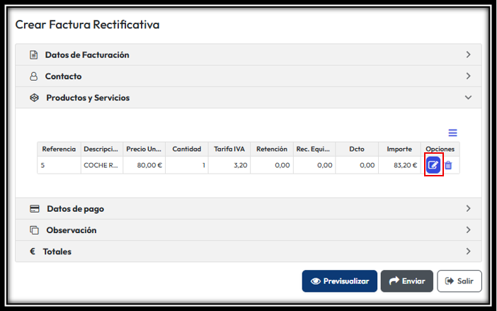 Rectificar Artículos, esta opción le permite modificar dentro de la factura valores, numero de productos, impuestos o descuentos.