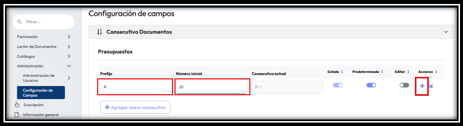 En el Menú izquierdo, en "Administración", "Configuración de campos", en "Presupuestos" indicará el Prefijo y el Número inicial, para la numeración de los consecutivos de sus presupuestos, después hacer clic en el signo +, para guardar los cambios: