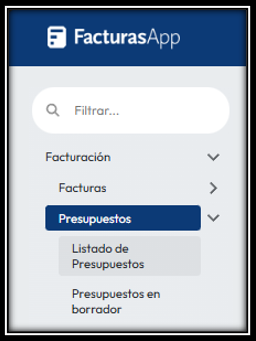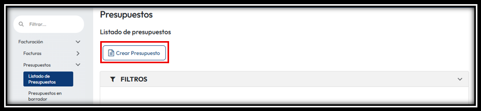 En el menú izquierdo, “Facturación”, “Presupuestos”, pestaña de “Listado de Presupuestos”, en la página del listado encontrara un botón, para “Crear Presupuesto”, hacer clic: