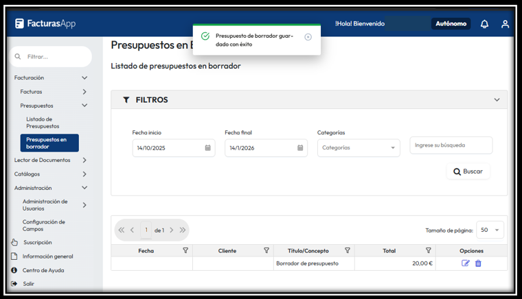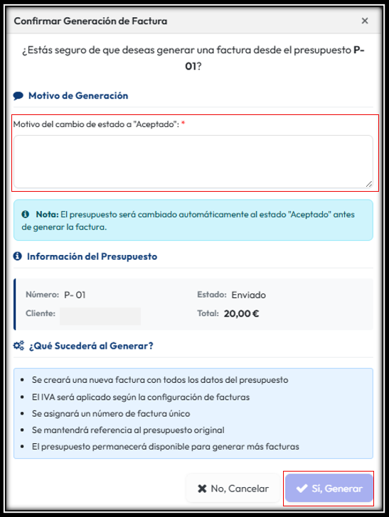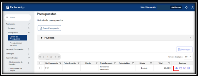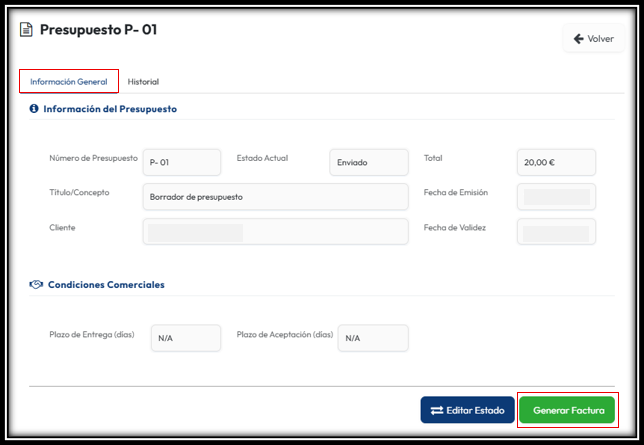 También puede generar la factura a partir de este presupuesto, haciendo clic en el botón “Generar Factura”
