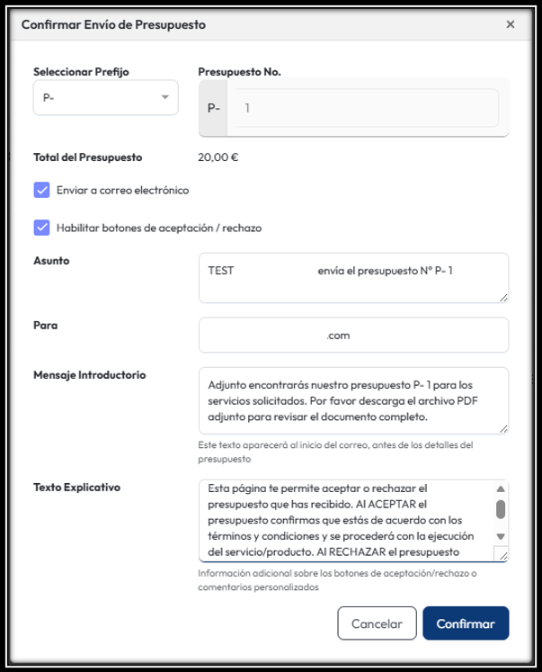 El sistema da la opción de elegir el texto del Asunto, el o los correos electrónicos a los cuales enviará el presupuesto, el mensaje de Introducción y el texto explicativo; siempre recuerde hacer clic en el botón “Confirmar”: