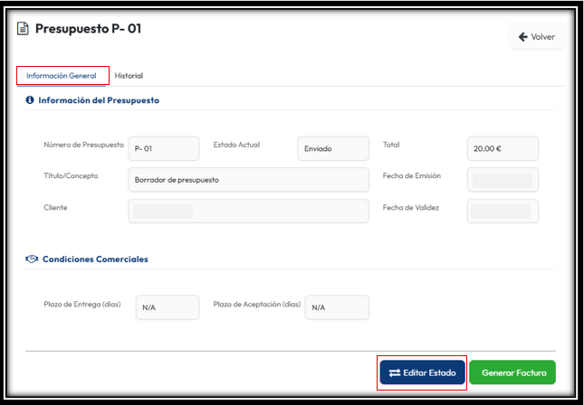 En información general, podrá ver la información del presupuesto y las condiciones comerciales; puede hacer clic en “Editar Estado” para modificarlo y hacer clic en “Confirmar cambio” para guardar la información:
