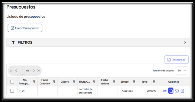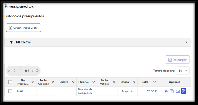 D. "PDF": permite ver el presupuesto en formato PDF.