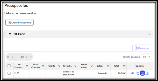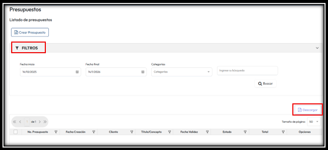 En “Listado de Presupuestos” podrá encontrar el listado de los presupuestos generados para los clientes, se puede filtrar para las búsquedas o descargar para informes: