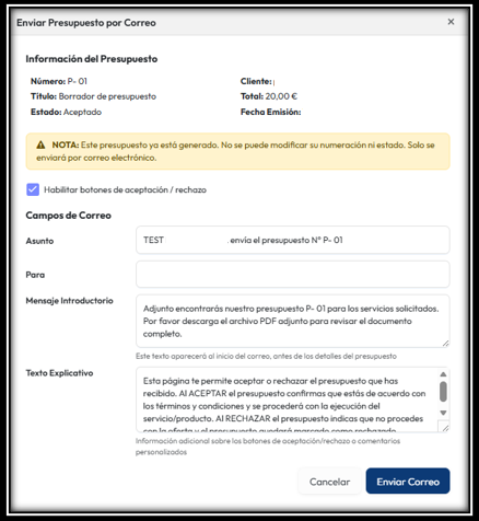 - “Enviar”: en esta opción, puede enviar por correo electrónico el presupuesto al cliente.