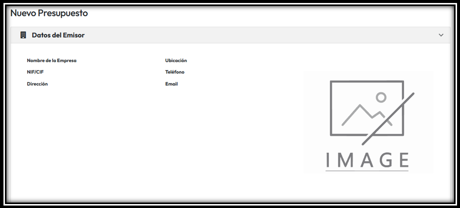 2.1. Datos de Emisor: En esta pestaña se encontrará la información previamente guardada de la empresa, como Nombre comercial, NIF/CIF, Dirección y Ubicación de la empresa, Teléfono, Email y el Logo: