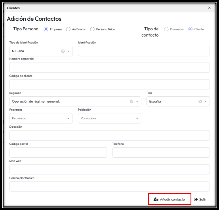 Si no se ha parametrizado esta información previamente, se puede hacer desde este paso en el botón “Agregar”; ingresar toda la información solicitada en el formulario y finaliza con el botón “Añadir Contacto”: