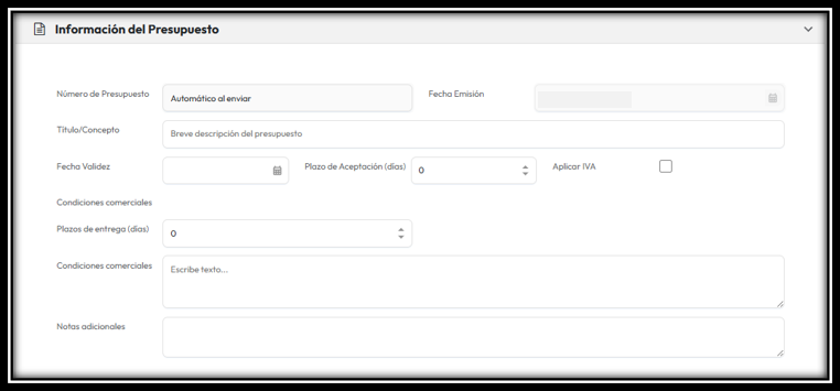 2.3. Información del Presupuesto: En esta sección podrá verificar y configurar la Fecha de emisión, el concepto, la Fecha de validez, el Plazo de aceptación, si desea aplicar el IVA, plazo de entrega y anotaciones sobre condiciones comerciales o notas adicionales: