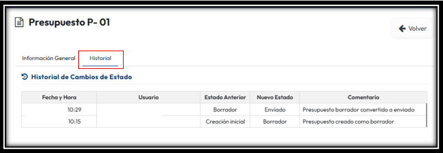 En la parte de Historial, puede ver el listado del movimiento de este presupuesto:
