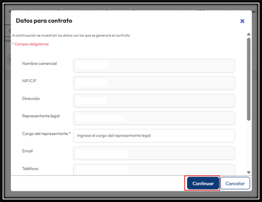 Ingrese la información correspondiente en todos los campos obligatorios y haga clic en “Continuar” para finalizar el proceso.