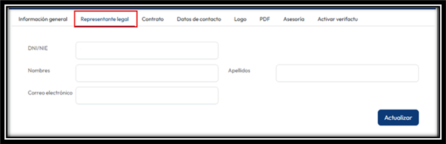 Acceda a la pestaña “Representante Legal” e ingrese toda la información requerida. Finalizado el proceso, haga clic en “Actualizar” para que los cambios queden guardados.