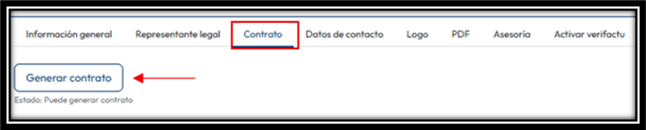 Una vez confirmada la información, diríjase a la pestaña “Contrato” y haga clic en el botón “Generar contrato”.